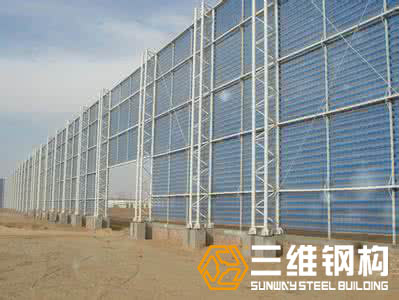 钢结构防风抑尘墙主要用于煤矿,焦化厂,电厂等企业工厂的储煤厂的防风抑尘;港口,钢铁、建材、水泥等企业各种露天料场的抑尘;农作物防风,沙化天气防尘等恶劣环境;铁路、公路煤炭集运站储煤场、建筑工地、道路扬尘、高速公路两侧等。单层挡风抑尘墙抑尘效果可达65~85%,双层挡风抑尘墙效果可达95%以上,抑尘墙的形式主要有哪些。