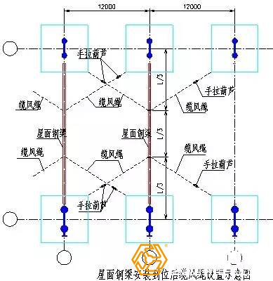 屋面钢梁吊装到位后,在松钩之前应连接相关屋面钢檩条等,使之形成一个空间框架的稳定结构。如果不能在松钩之前安装屋面钢檩条,为防止屋架钢梁歪扭,应拉设缆风绳。缆风绳在吊装之前固定到屋架钢梁上,共设四根,拉设位置在钢梁长度的1/3处,下面拉设在附近的钢柱柱脚。缆风绳选用Ф13.5mm,使用1T手拉葫芦拉紧。屋面主钢梁间连梁安装后,即可拆除缆风绳。