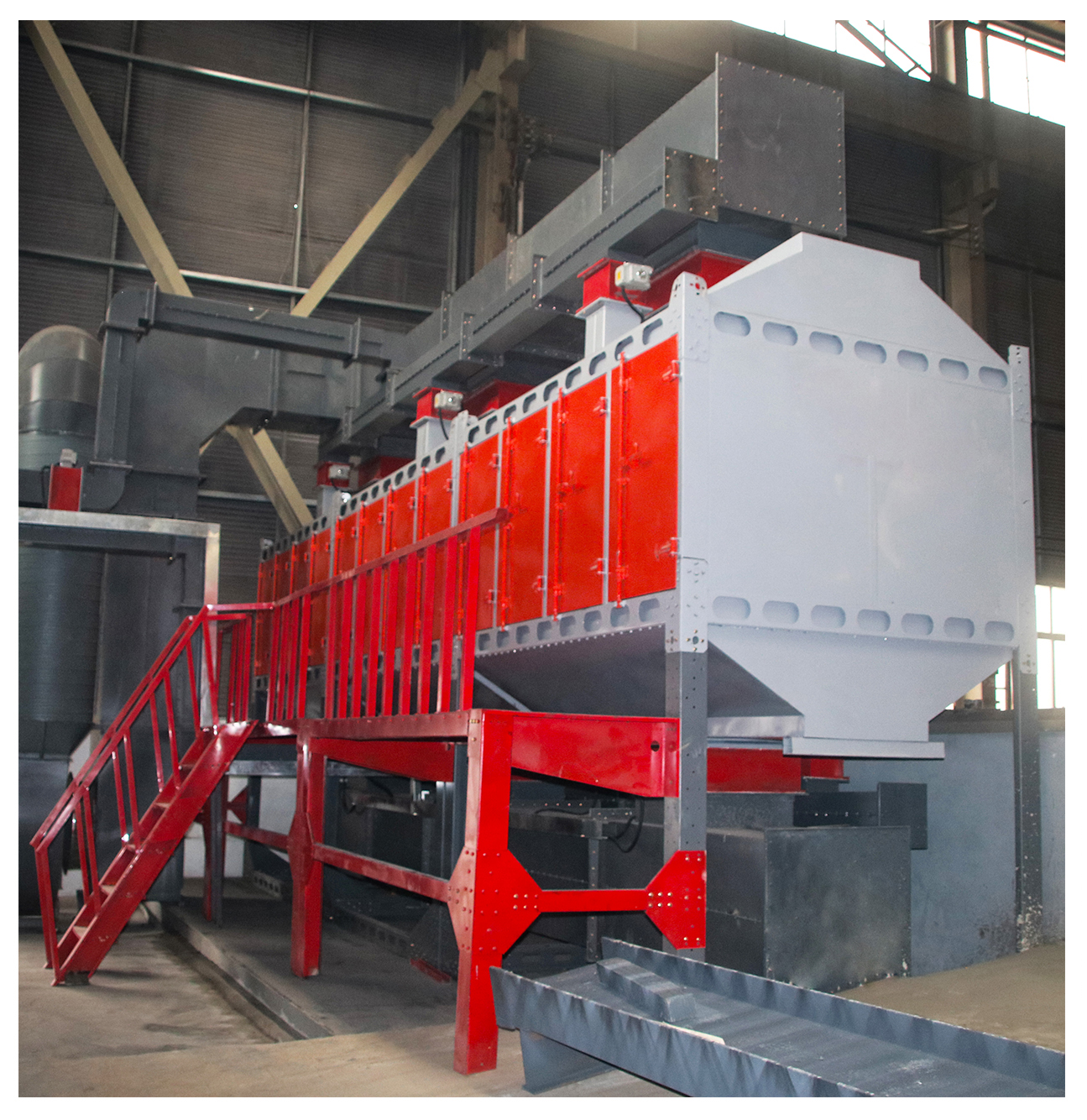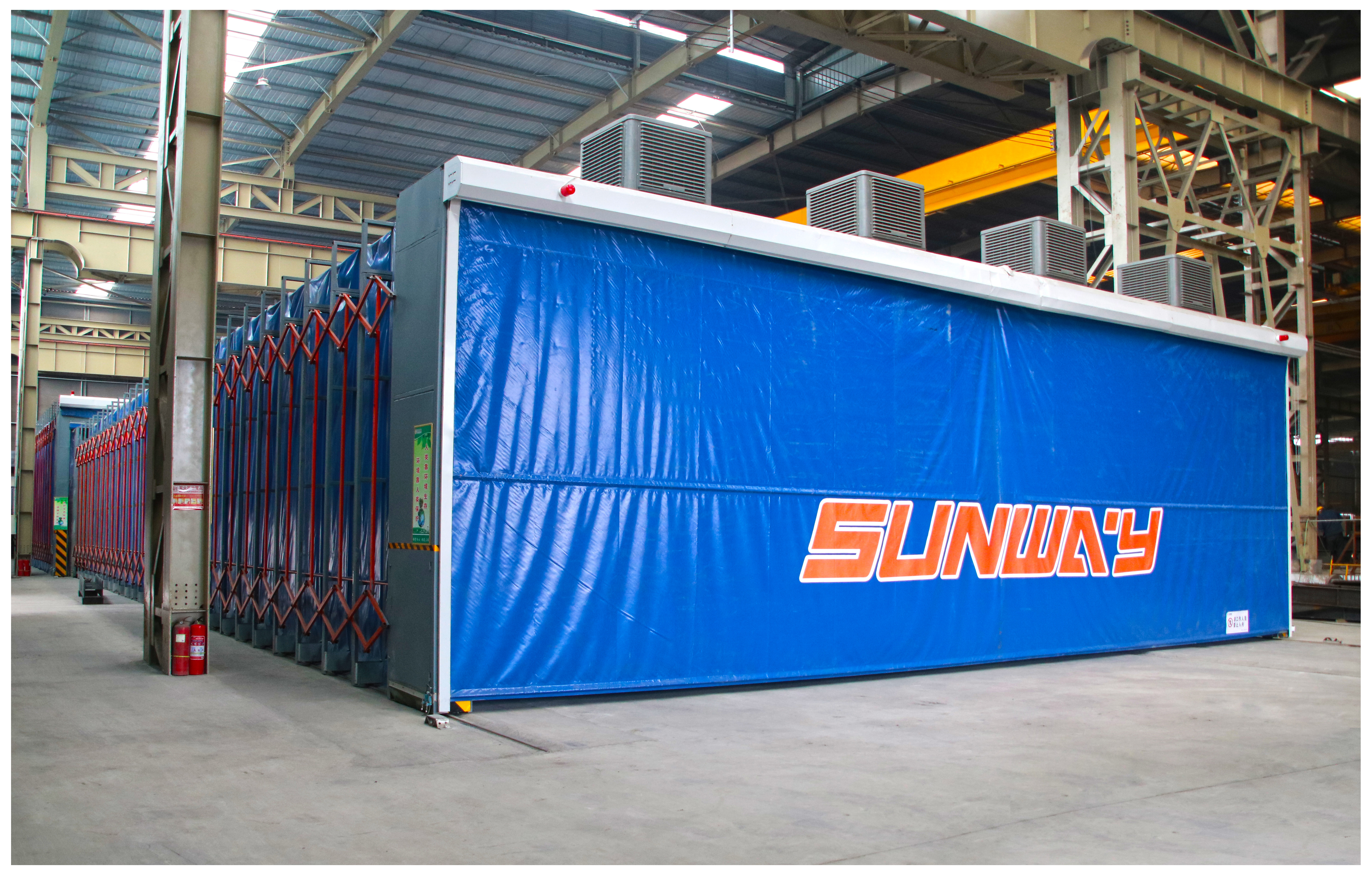 原来这个50米长的装备学名为“伸缩式干式喷雾处理喷漆库房”,它主要由轨道、移动框架室体、照明系统、干式漆雾处理箱和电控系统组成。采用“两级过滤+活性碳吸附+浓缩+催化燃烧”的工作原理,通过催化燃烧过程,借助于催化剂的吸附作用,使有机废气产生无焰燃烧,并氧化分解为CO2和H2O,同时释放出大量热能,从而去除废气中有害物质,净化成洁净气体由主排风机排入大气中,达到降能环保功效。