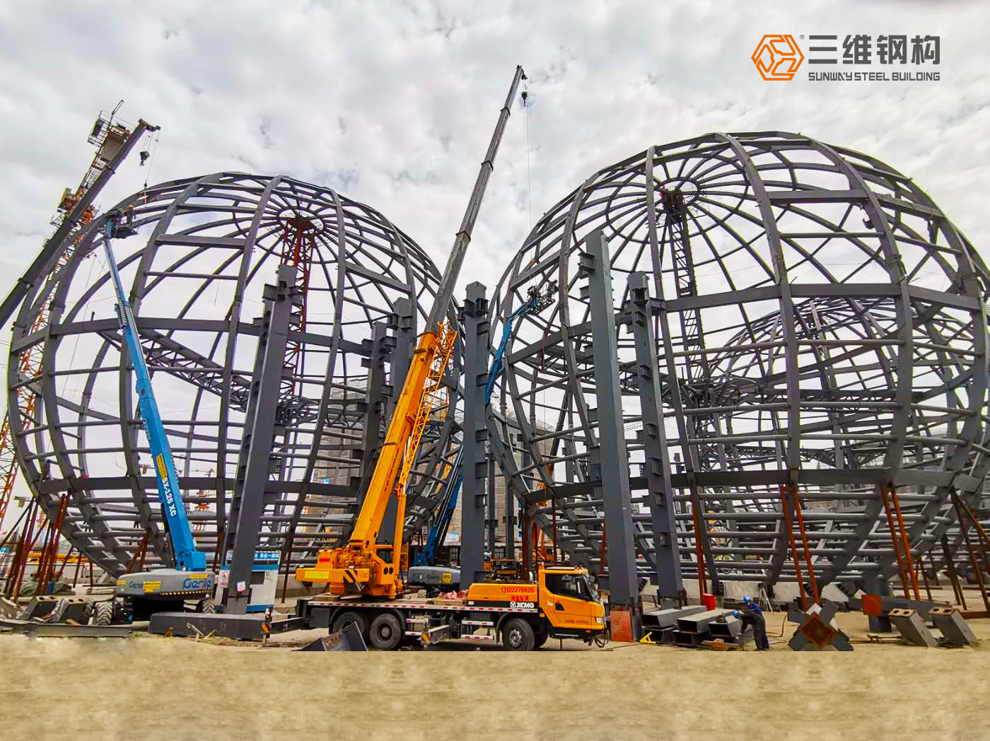 原来这三个大铁球是由三维钢构参与建造的第四代全新科技体验馆项目,建成以后,将成为世界首创的同时拥有三个直径40米的720度球幕高科技体验馆。