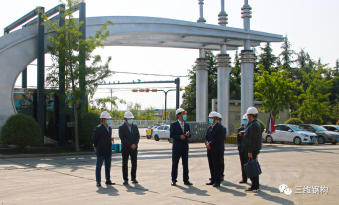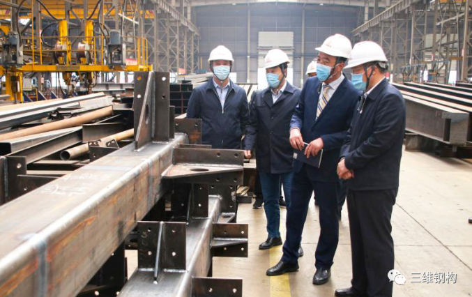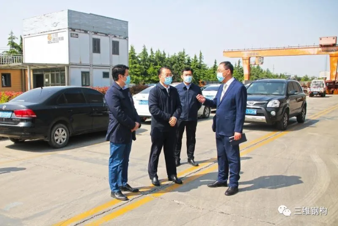 2020年4月21日上午,在枣庄市民营企业高质量发展服务一队队长王涛同志和三维钢构董事长杨维生的陪同下,枣庄市住房城乡建设局党组副书记、住房建设事业发展中心主任李玉森莅临我公司调研考察。