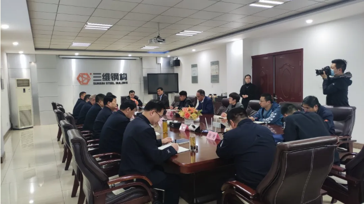 调研中,田局长听取了杨董关于企业运行、安全生产、周边治安状况等情况的汇报。并对三维钢构安全生产及治安环境给予充分肯定。同时强调,企业要牢固树立安全意识,严格落实各项安全措施,杜绝安全事故发生。杜副市长表示将抓好社区防控和企业防控两个重点,保持严打的高压态势,紧盯社区治安、合同纠纷、债权债务等突出问题,依法严厉打击各类涉疫违法犯罪活动。同时,加大矛盾排查化解力度,科学合理布警,形成工作合力,坚决防止发生井喷式违法犯罪活动,确保社会大局和谐稳定。